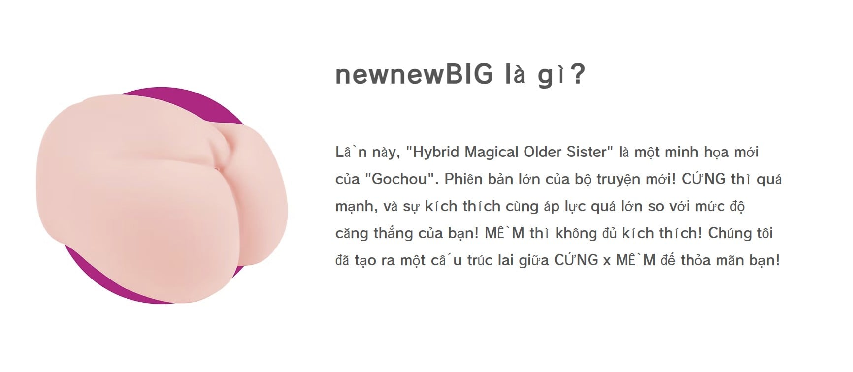 Nếu bạn cảm thấy căng thẳng vì cái CỨNG kích thích nhưng quá nhiều áp lực, nếu bạn cảm thấy như mình đang được bao bọc trong cái MỀM nhưng lại lo lắng về việc thiếu kích thích, nếu bạn muốn được bao bọc hoàn toàn trong một thứ gì đó lớn, thì newnewBIG này được phát triển dành cho bạn, nặng hơn 3600g.