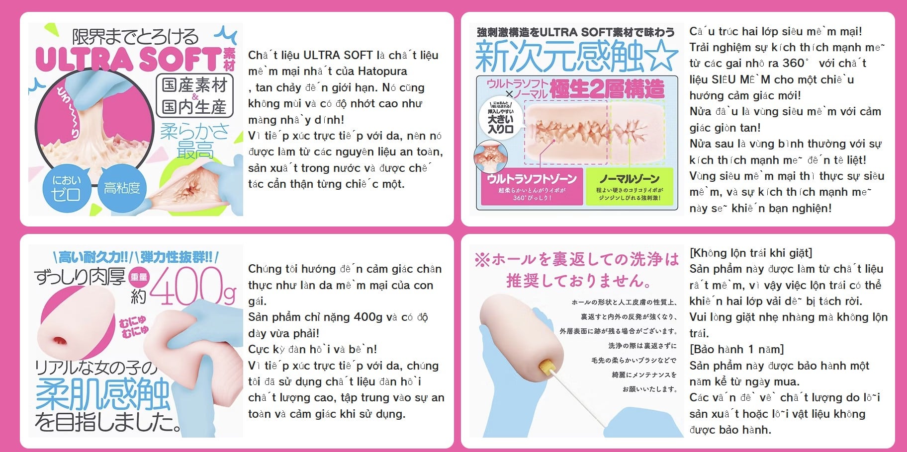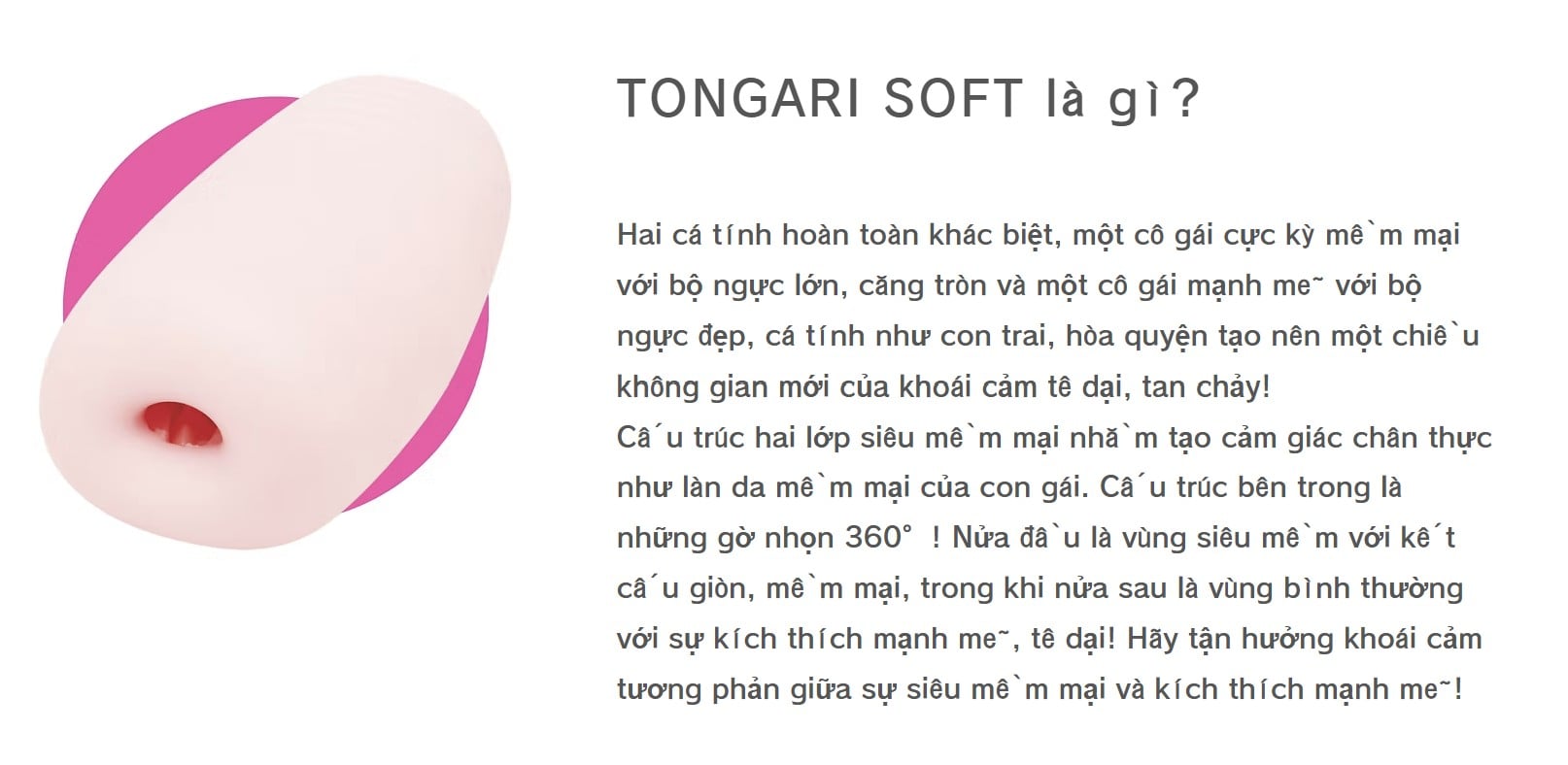 Cấu trúc bên trong được bao phủ bởi những gờ nhọn 360°! Trải nghiệm một chiều hướng kích thích mãnh liệt hoàn toàn mới với chất liệu SIÊU MỀM! Nửa đầu là vùng siêu mềm với cảm giác giòn tan! Nửa sau là vùng bình thường với cảm giác kích thích mạnh mẽ đến tê người! Khoảng cách giữa vùng siêu mềm và vùng kích thích mạnh mẽ sẽ khiến bạn nghiện!